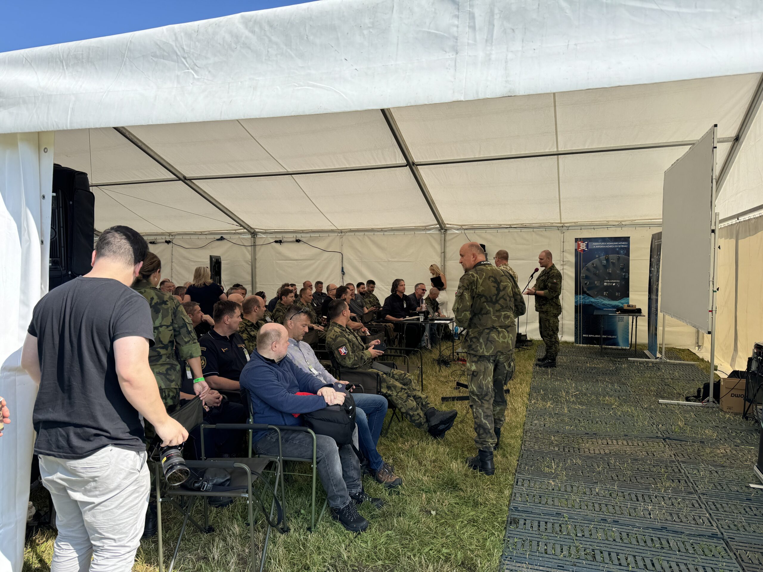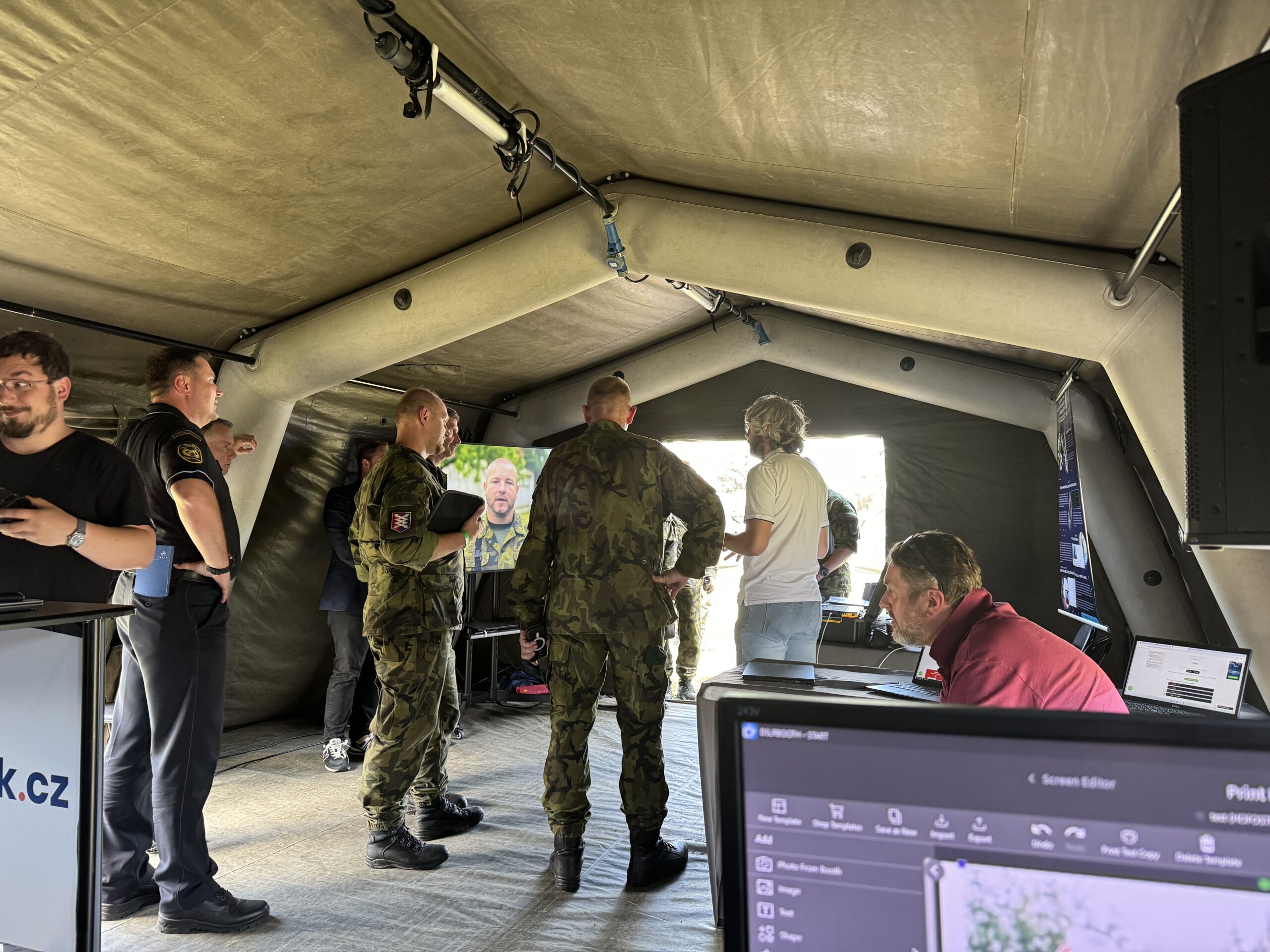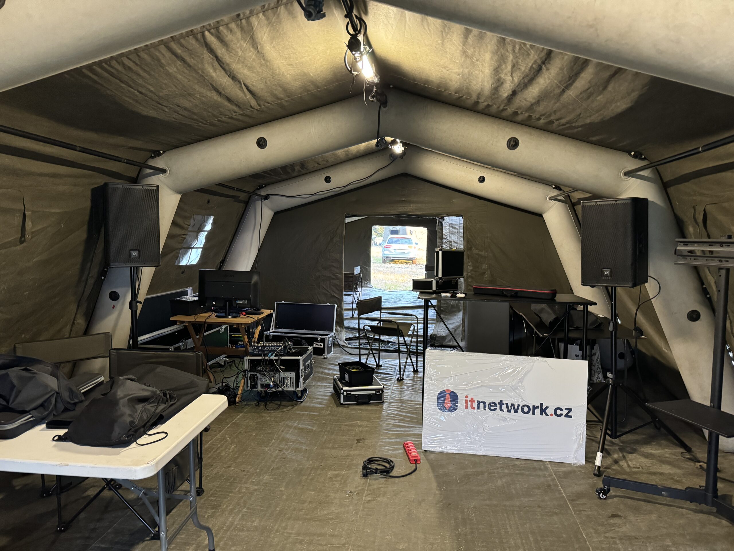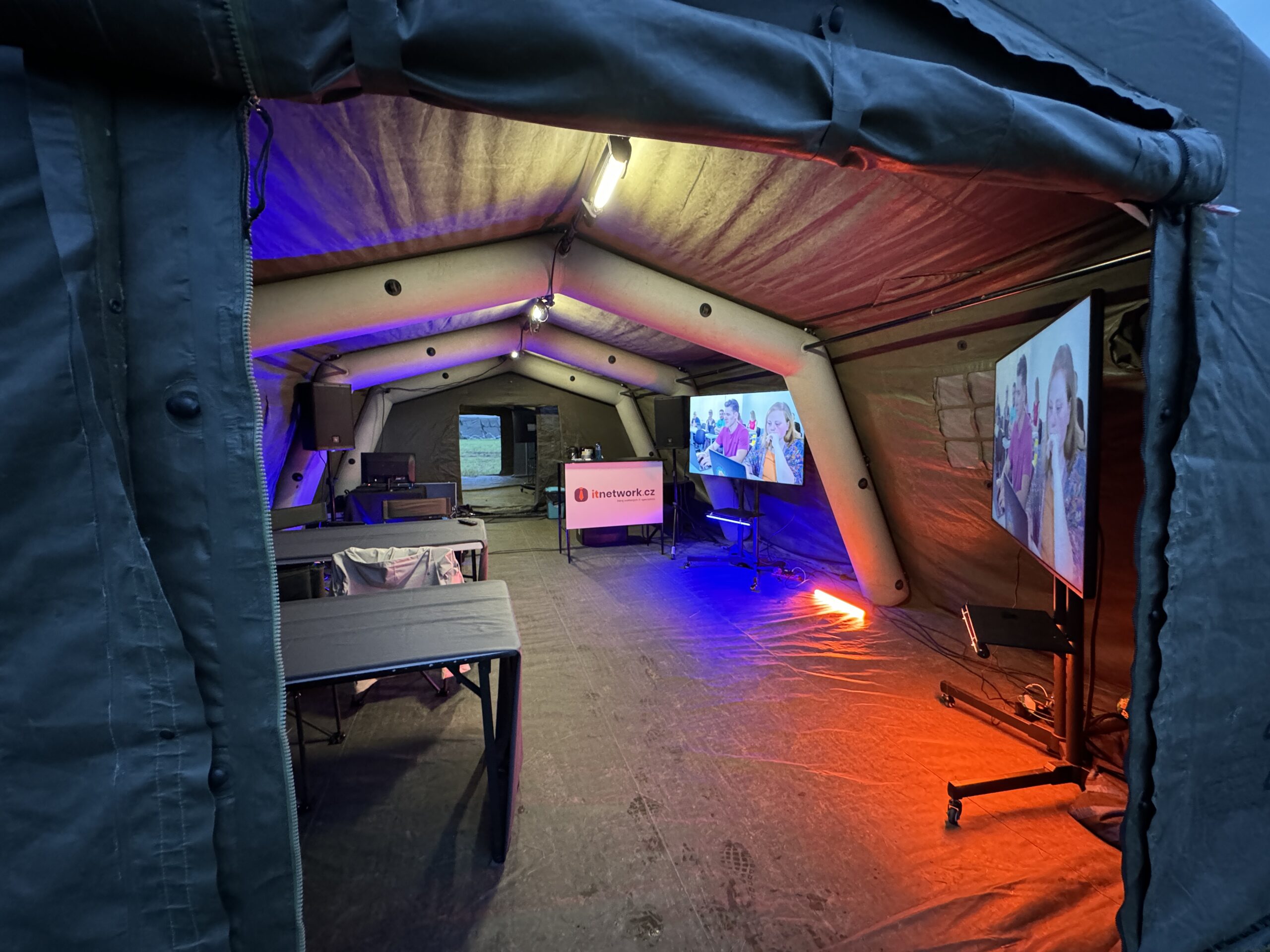 Technicky jsme zabezpečili prezentaci ve vojenském nafukovacím stanu. Hudba, projekce, světla, ITNetwork si zasloužil být pořádně vidět. Jsme rádi, že jsme mohli přispět k navázaní spolupráce cílené rekvalifikace ICT specialistů v Armádě ČR.